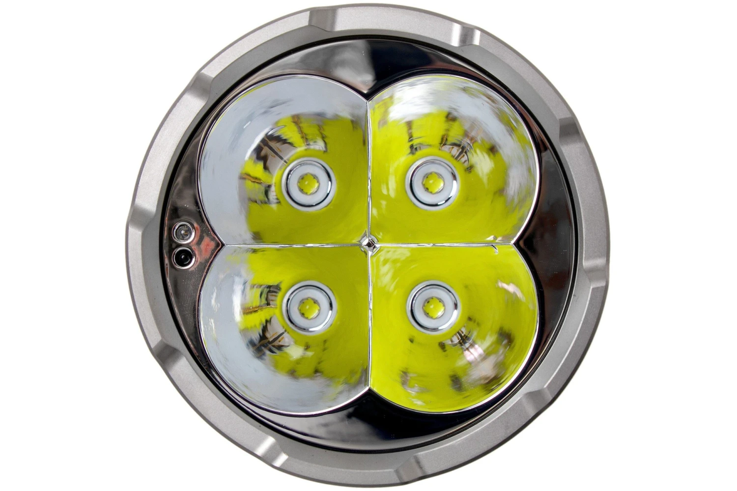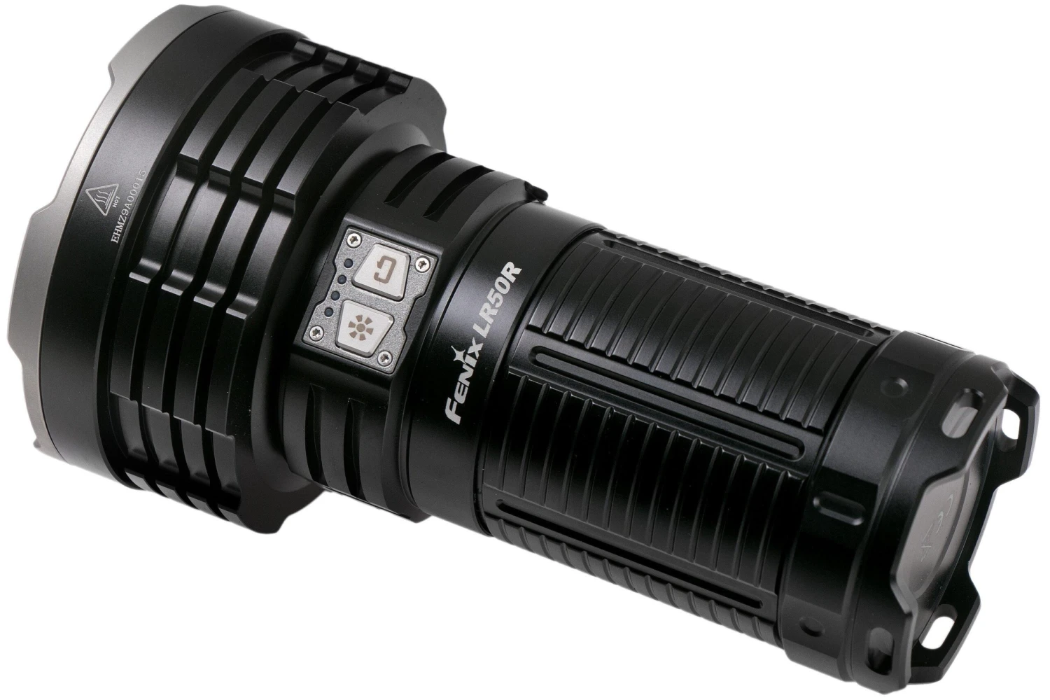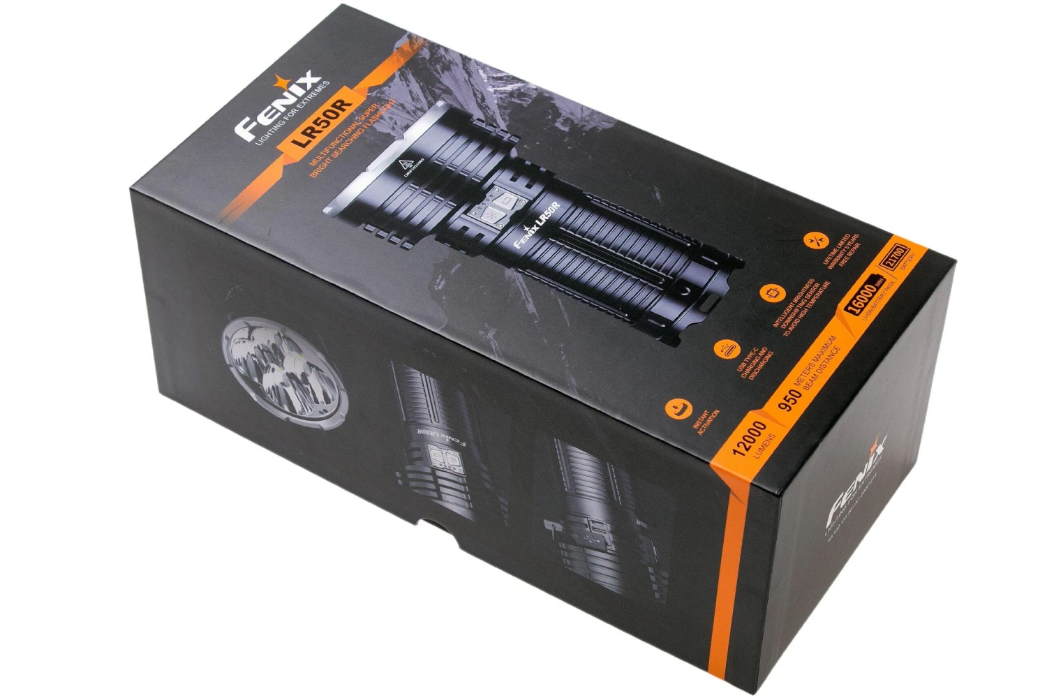 Die Fenix LR50R ist eine extrem starke, aufladbare Taschenlampe mit 4 starken Luminus SST70 LEDs und einer Lichtleistung von 12000 Lumen. Ein echtes Kraftpaket! Die Lampe bietet einen Abstrahlwinkel von 75° und eine Reichweite von 950 m. So wirst Du mit der Fenix LR50R bei Such- und Rettungsaktionen nichts übersehen. Dieses Kraftpaket ist mit einem intelligenten Sensor ausgestattet, der seine Helligkeit automatisch anpasst, wenn Du ein Objekt, das weniger als 6 cm entfernt ist länger als 1,5 Sekunden beleuchtest.
