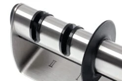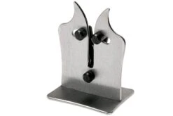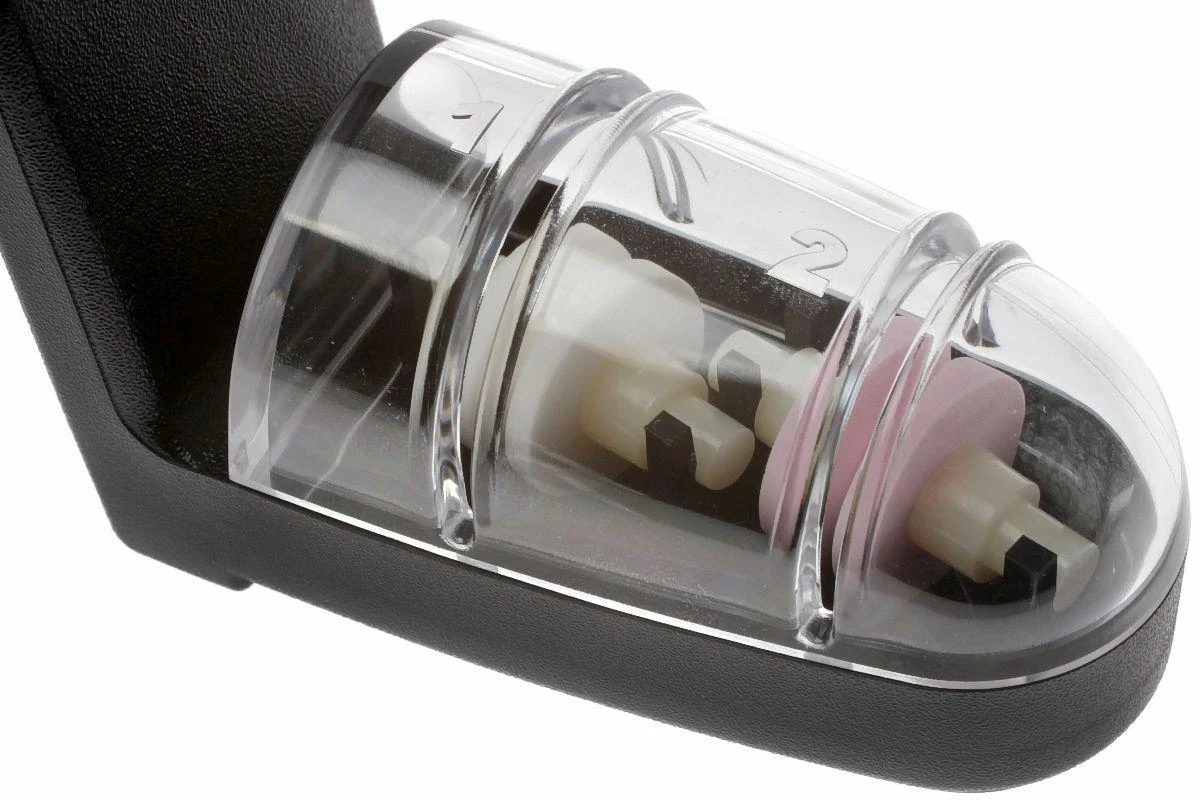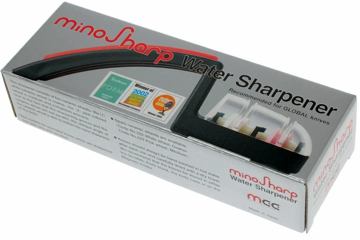 Noch einfacher als mit diesem Global Messerschleifer sind Messer nicht zu schärfen oder scharf zu halten! Einfach etwas Wasser in den Behälter füllen, 7 bis 10 Mal das Messer langsam und nur mit leichtem Druck (um Beschädigung der Rollen zu verhindern) durch beide Schleifrollen führen, und Ihr Messer ist wieder scharf. Beginnen Sie mit der weißen, etwas gröberen Schleifrolle an und gehen Sie über zur feineren rosafarbenen Schleifrolle. Spülen Sie das Messer anschießend unter heißen Wasser ab. Die Schlitze sind nicht parallel mit den Rollen, sodass automatisch der richtige Schleifwinkel entsteht und das Messer perfekt geschliffen wird.