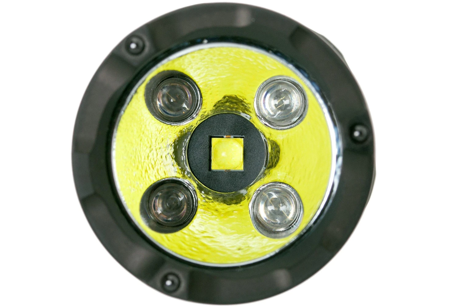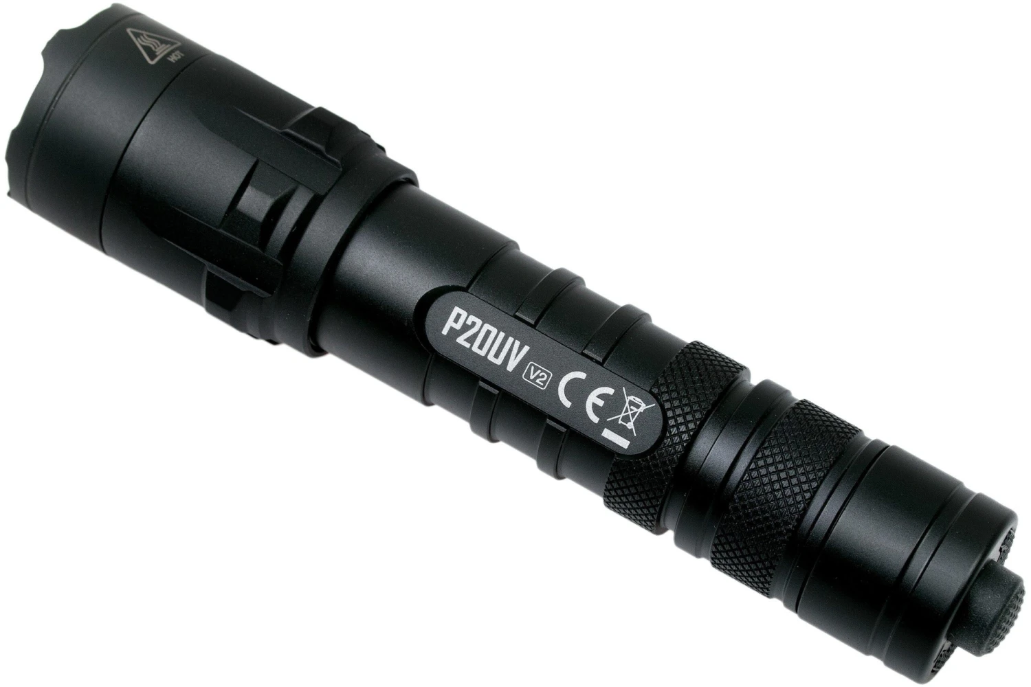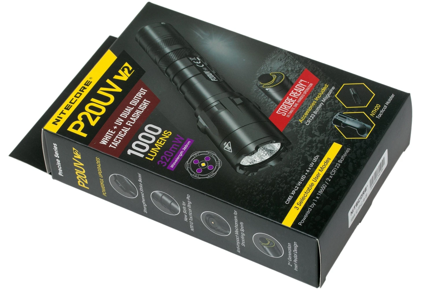 Die Nitecore P20UV V2 ist eine starke Taschenlampe mit einem Lichtstrahl von 1000 Lumen. Mit einer Reichweite von 164 m ist die Nitecore P20UV V2 perfekt für den Einsatz bei der Polizei, für Sicherheitskräfte oder für den täglichen Gebrauch unter rauen Bedingungen geeignet. Außerdem bringt dieses Kraftpaket 4 UV LEDs mit, praktisch für Inspektionen, die Forensik und um Geld oder Ausweise zu kontrollieren. Das Gehäuse der Taschenlampe ist aus dem keramischen Material Siliziumnitrid gefertigt, was sie zum Zerbrechen von Glas geeignet macht. Die Nitecore P20UV V2 übersteht einen Fall aus 1 m Höhe und ist wasserdicht bis zu einer Tiefe von 2 m. Diese Taschenlampe verfügt über einen Verpolungsschutz mit „anti-impact“-Funktion, was sie zu einer perfekten Lampe für den Schießsport macht.