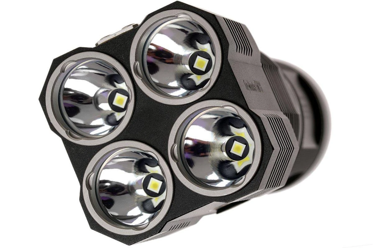 Die NiteCore TM28 QuadRay Tiny Monster ist eine unglaublich leistungsstarke Lampe. Der TM28 ist sehr kompakt und mit vielen intelligenten Funktionen ausgestattet. Er wird nicht umsonst Tiny Monster genannt. Die 4 integrierten Lampenköpfe sind mit 4 Cree XHP35 LEDs ausgestattet. Zusammen liefern sie 6000 ANSI-Lumen. Das ist eine enorme Lichtmenge, vergleichbar mit dem doppelten Scheinwerferlicht eines Autos.