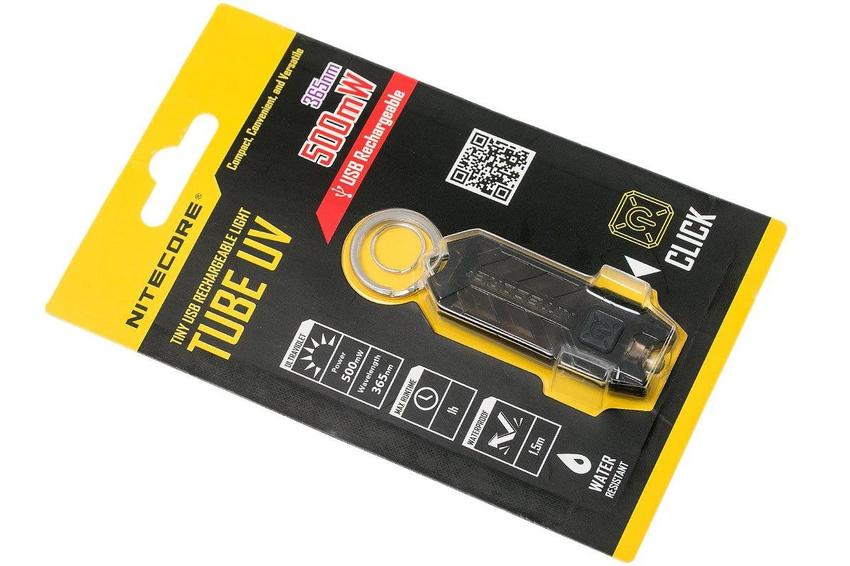 Die NiteCore Tube UV ist eine sehr praktische wiederaufladbare Schlüsselbundlampe. Bei der Größe eines Autoschlüssels merkt man kaum, dass man sie bei sich hat. Die Taschenlampe ist mit einem integrierten Lithium-Ionen-Akku ausgestattet. Dieser kann einfach über USB wieder aufgeladen werden. Du musst also keine Batterien wechseln. Das Gehäuse besteht aus hochwertigem Polycarbonat, von dem auch Sporthelme, DVDs und Produkte für die Luftfahrt stammen. Damit ist die Lampe nach IP65 wasser- und staubdicht und hält einem Fall von maximal 1,5 Meter stand.
