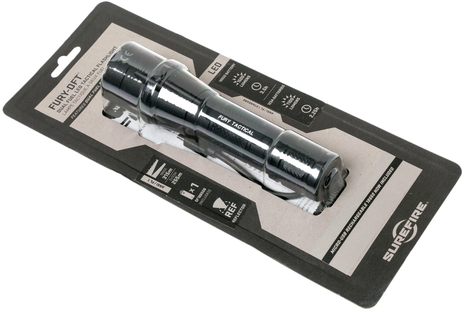 Die SureFire Fury-DFT Tactical ist eine taktische Taschenlampe. DFT steht für Dual Fuel Tactical. Das bedeutet, dass die Lampe entweder mit einem 18650-Akku oder zwei CR123A-Batterien betrieben werden kann. Das kann praktisch sein, wenn Dein 18650-Akku leer ist und Du ihn gerade nicht aufladen kannst. Mit zwei CR123A-Batterien bist Du erstmal wieder für 2,5 Stunden versorgt.