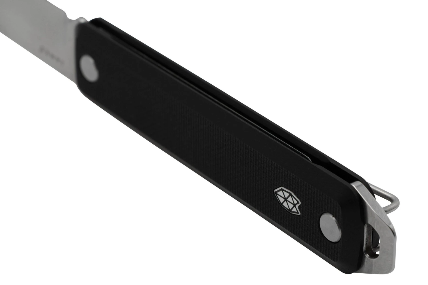 The James Brand Ellis Slim G10 Black ist eine spätere Version der Ellis- und Elko-Familie. Es hat das gleiche Design wie das traditionelle Ellis, aber die Schere wurden entfernt, um das schlankste und einfachste Ellis aller Zeiten zu schaffen. Die Klinge besteht aus Sandvik 12C27 Stahl, einem beliebten rostfreien Stahl, der leicht zu schleifen ist. Der Backlock wurde durch einen Slipjoint ersetzt. Dadurch wird sichergestellt, dass die Klinge beim Öffnen nicht vollständig einrastet, sodass Du dieses Messer fast überall hin mitnehmen kannst. The James Brand hat den Griff mit einem Schild versehen, das das authentische Gefühl eines traditionellen Herrenmessers vermittelt. Wie bei dem Originalmesser fungiert der Backspacer als Mini-Brecheisen. Der Griff ist aus G10, einem starken, wasserfesten Kunststoff, gefertigt. Der Griff ist mit einem Deep-Carry-Pocketclip ausgestattet, sodass das Messer leicht zu tragen ist.